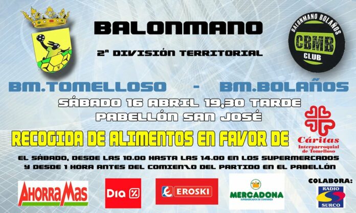 El Club Balonmano Tomelloso ha organizado una recogida de alimentos a favor de Cáritas. Esta acción solidaria tendrá lugar el próximo sábado 16 de abril, con motivo del último partido de Segunda División Nacional de Balonmano frente a Balonmano Bolaños.