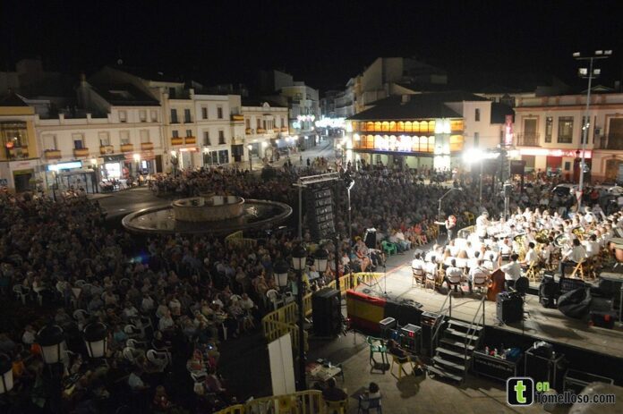 La plaza de España, en la que no cabía ni un alfiler, fue el escenario del Concierto de la Asociación Musical Santa Cecilia de Tomelloso. Miles de aficionados disfrutaron del espectáculo musical que tuvo a la copla como leitmotiv. Acompañados por la presentadora y cantante Lucía Escribano.