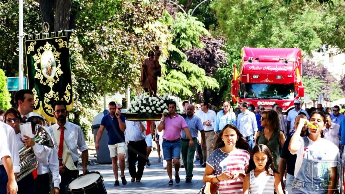 Tras la celebración de una misa en honor de San Cristóbal en la parroquia de la Asunción, a las 11 de la mañana partió la procesión de la plaza de España con el acompañamiento, de la junta directiva, miembros de los grupos municipales PSOE y PP ,y musical de la Banda Jesús del Perdón hasta la avenida Antonio Huertas, frente al Estadio Paco Gálvez. San Cristóbal, sobre un camión, ha recibido los saludos y ramos de flores de los participantes en el desfile que ha abierto un grupo de motoristas.