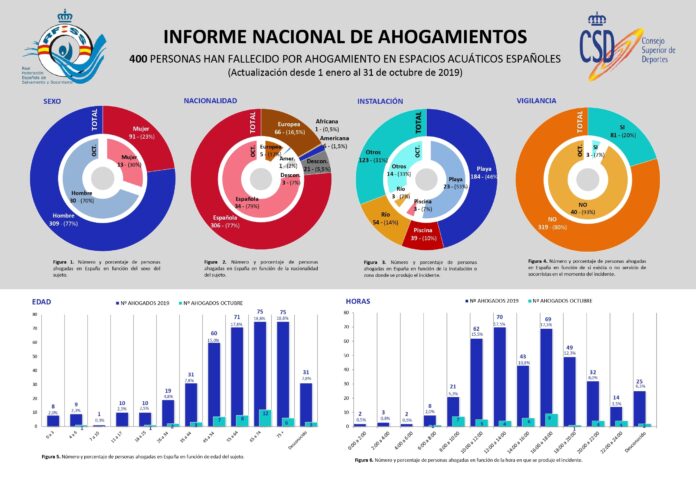 En lo que respecta a los óbitos producidos el último mes, octubre de 2019, con 43 muertes por ahogamiento, se sitúa en el segundo peor mes de los últimos cinco años, tan solo superado por las 49 muertes ocurridas en el mismo periodo del año 2015. La cifra de este año ha superado en tres a los registrados el año pasado, cuando se dieron 43, en trece a los de 2017, que finalizó con 30, y en dieciocho a los de 2016, con 25.