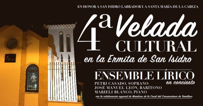 Un año más la Hermandad de San Isidro de Tomelloso vuelve a organizar su Velada Cultural, en honor a los patrones patrones, San Isidro Labrador y Santa María de la Cabeza. Una velada que se celebra en un marco incomparable, como es la Ermita de San Isidro, y que se ha convertido ya en un clásico de las noches veraniegas de Tomelloso. Este año celebra su cuarta edición, que no sería posible sin la colaboración del Ayuntamiento de Tomelloso.