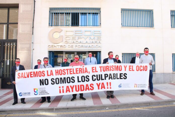 Una representación de la hostelería de Guadalajara, con el apoyo de algunos cargos políticos de la provincia, se han concentrado ante las puertas de la Confederación de Empresarios para poner de relieve, una vez más, la situación «agónica» que atraviesa el sector hostelero y «rogar» ayudas directas.
