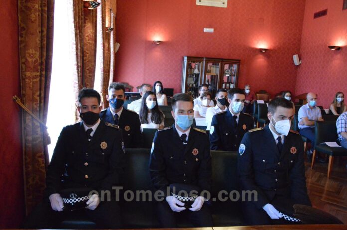 En un acto institucional celebrado hoy viernes en el salón de actos del Ayuntamiento, han tomado posesión de su cargo 5 nuevos empleados públicos que formarán parte del cuerpo de la Policía Local de Tomelloso. Arturo Gómez Gutiérrez, Félix Cobo Rosell, Daniel Moreno Villalba, Javier Ávila Díaz-Naranjo y Óscar Díaz Dapica han jurado su cargo ante la alcaldesa de Tomelloso, Inmaculada Jiménez; el delegado provincial de Administraciones Públicas, Francisco Pérez; el concejal responsable de la Policía Local, Francisco José Barato; el Subinspector Jefe de la Policía Local, Alberto Espuña y concejales de los grupos PSOE, PP y Vox. Controlándose todas las medidas de seguridad y aforo establecidas, también han asistido familiares de los nuevos agentes y representantes de la Guardia Civil, Policía Nacional y Protección Civil de Tomelloso.