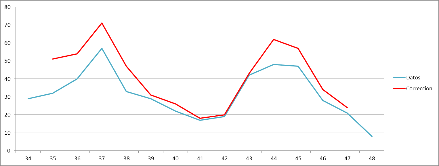 Sin embargo, la tendencia cambiaba significativamente cuando la semana siguiente, del 19 al 25 de octubre, se duplicaba la cifra de nuevos casos, pasando de 20 a 43, cifra que volvía a multiplicarse durante la semana del 26 de octubre al 1 de noviembre, pasando en esta ocasión a sumar 62 nuevos casos. Esta cifra comenzaría a bajar de nuevo ligeramente del 2 al 8 de noviembre con 57 casos nuevos, del 9 al 15 de noviembre con 34 y del 16 al 22 de noviembre con 24.
