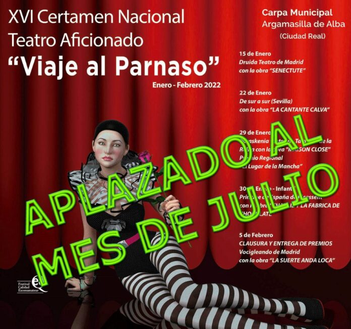 La Concejalía de Cultura del Ayuntamiento de Argamasilla de Alba, en coordinación con el grupo Primer Acto Teatro, notifica el aplazamiento del Festival de Teatro Aficionado “Viaje al Parnaso 2022”, cuya inauguración y representación de la primera obra estaba prevista para este sábado 15 de enero, a las 20:30 horas, en el Auditorio de Verano (Carpa Municipal).