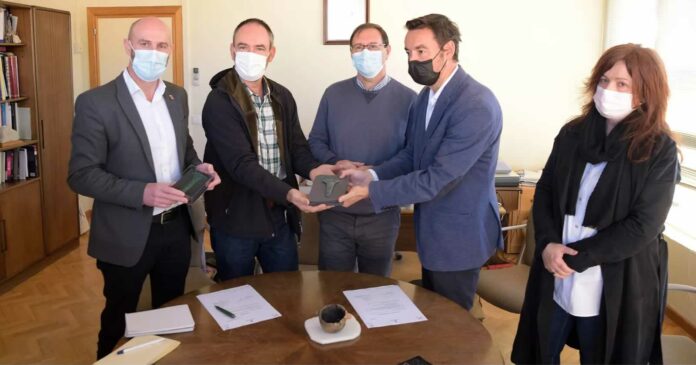 El alcalde de Argamasilla de Alba, Pedro Ángel Jiménez, y el arqueólogo director de las excavaciones en la Motilla del Retamar, Luis Benítez de Lugo, junto al jefe de servicio de Cultura en Ciudad Real de la JCCM, Enrique Jiménez, y la vicepresidenta de la Diputación Provincial y concejala de Turismo del Ayuntamiento de Argamasilla de Alba, Noelia Serrano, han entregado este viernes al director del Museo de Ciudad Real, Ignacio de la Torre, una alabarda, “única en Castilla-La Mancha” y de las que existen muy pocas en Europa, junto a un cuenco de cerámica para el grano, hallados en las excavaciones arqueológicas realizadas en la Motilla del Retamar.
