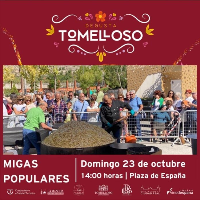 ‘Degusta Tomelloso’, la muestra alimentaria que desde ayer se puede visitar en la Plaza de España de la localidad vivirá el domingo, día en el que cerrará sus puertas, una gran celebración gastronómica popular, con las migas manchegas como protagonistas. A partir de las 14:00 h. se servirán entre el público asistente 2.000 raciones gratuitas de este tradicional plato, propio de la época de vendimia, en el que no faltarán, como marcan las costumbres, las uvas de la tierra.