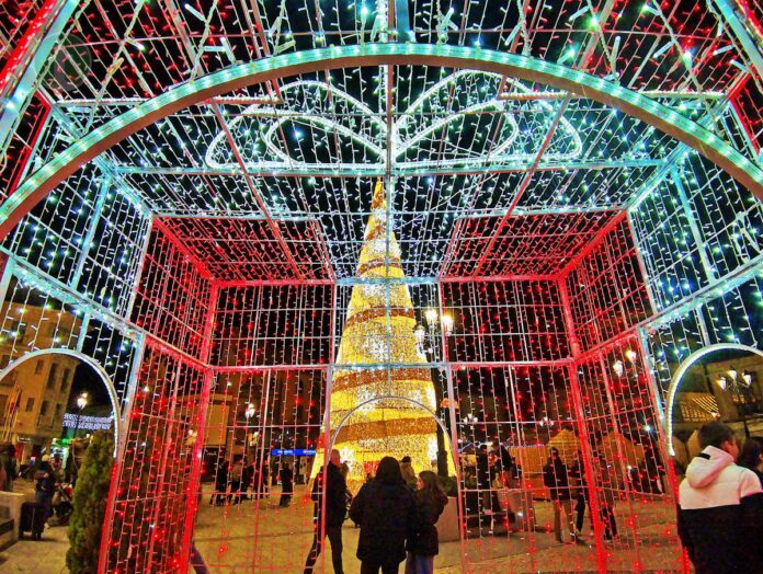 El centro neurálgico de la ciudad también lo es en cuestión de decoración navideña. Las casetas de madera, más discretas que las feriadas del Paseo de las Moreras, dejan todo el protagonismo al gran Árbol de Navidad, un enorme cono luminoso de 22 metros de altura que el ingenio popular ha bautizado por su apariencia como “El Cobete”. Junto al icono del Árbol gigante más visible, un cubo gigante que simula un regalo con su envoltorio, y junto a la Plaza de España, la zona peatonal de la calle Independencia luce una bonita iluminación que simula tiras de espumillón.