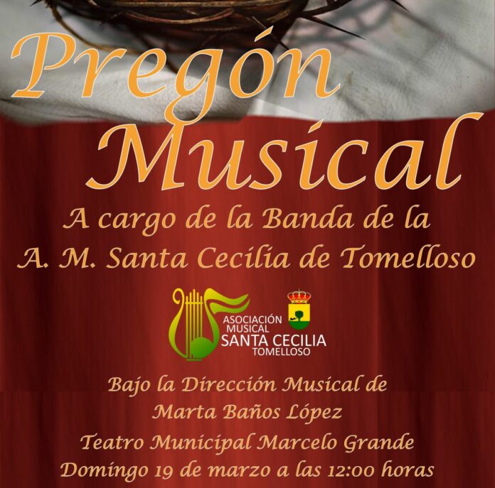 Este domingo, 19 de marzo, a las 12.00 horas y desde el Teatro Municipal Marcelo Grande de Tomelloso, la Asociación Musical Santa Cecilia realizará el tradicional Pregón Musical de la Semana Santa. El evento estará organizado en conjunto con la Junta de Cofradías y Hermandades de Tomelloso y con la colaboración del Ayuntamiento de la localidad.