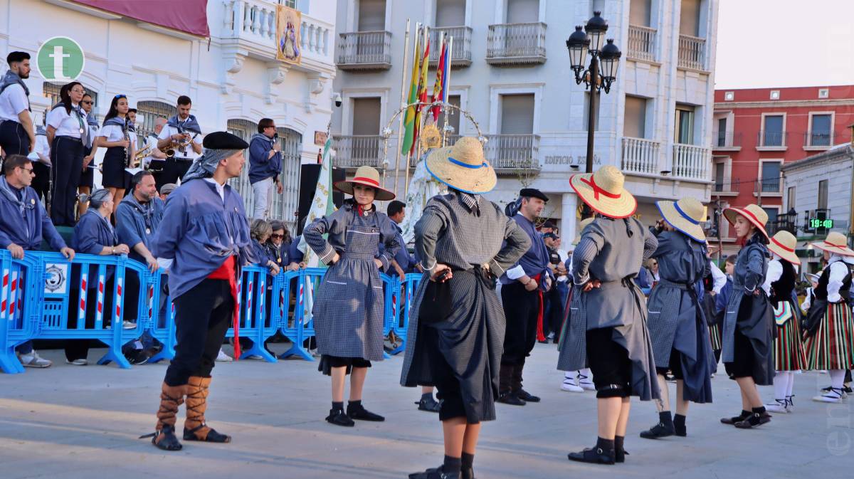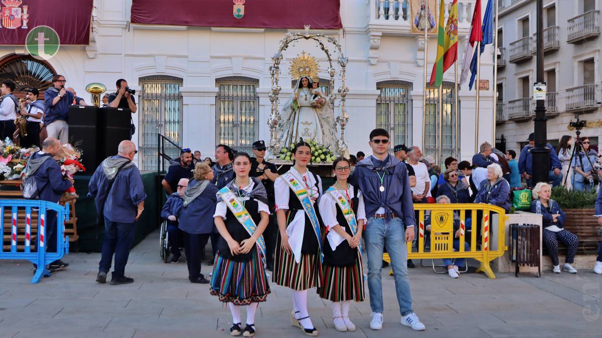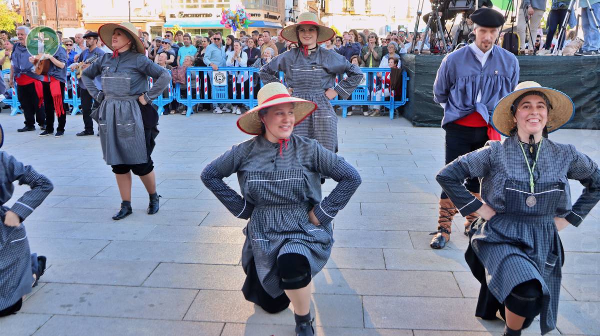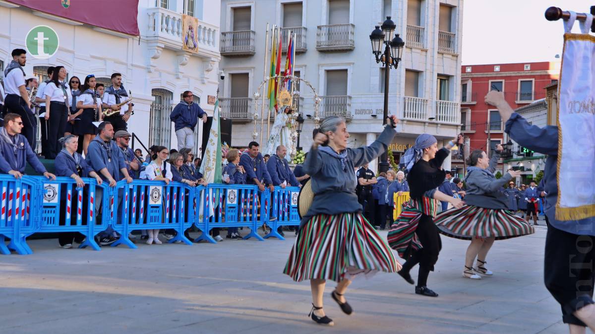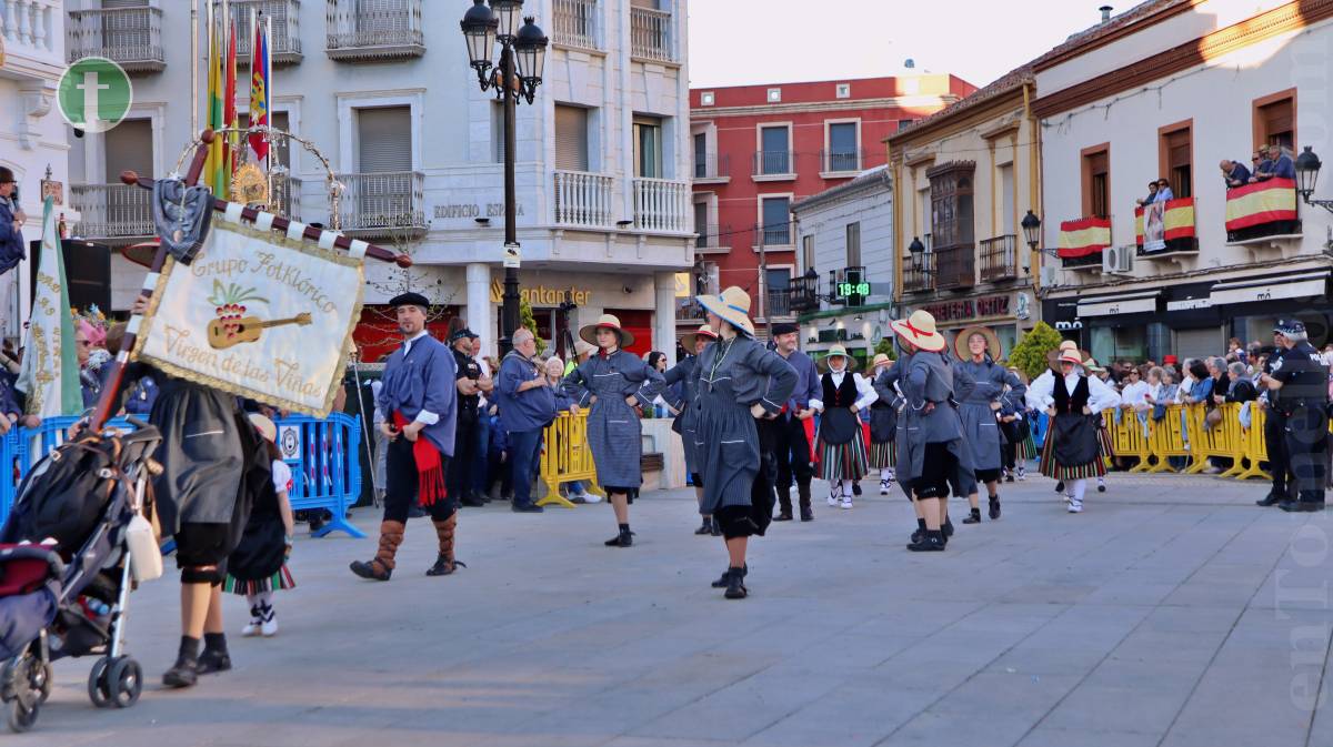 El desfile prosiguió con la participación de las madrinas y padrino de la Feria y Fiestas, que también saludaron a la Virgen. Los grupos folclóricos El Bombo y Virgen de las Viñas ofrecieron un emotivo baile tradicional frente a la patrona.