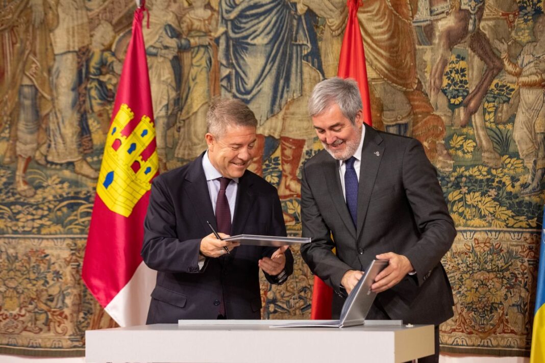 Un convenio que han rubricado el presidente de Castilla-La Mancha, Emiliano García-Page, y el presidente de las Islas Canarias, Fernando Clavijo, en un acto en el que también ha intervenido el vicepresidente primero del Gobierno castellanomanchego, José Luis Martínez Guijarro.