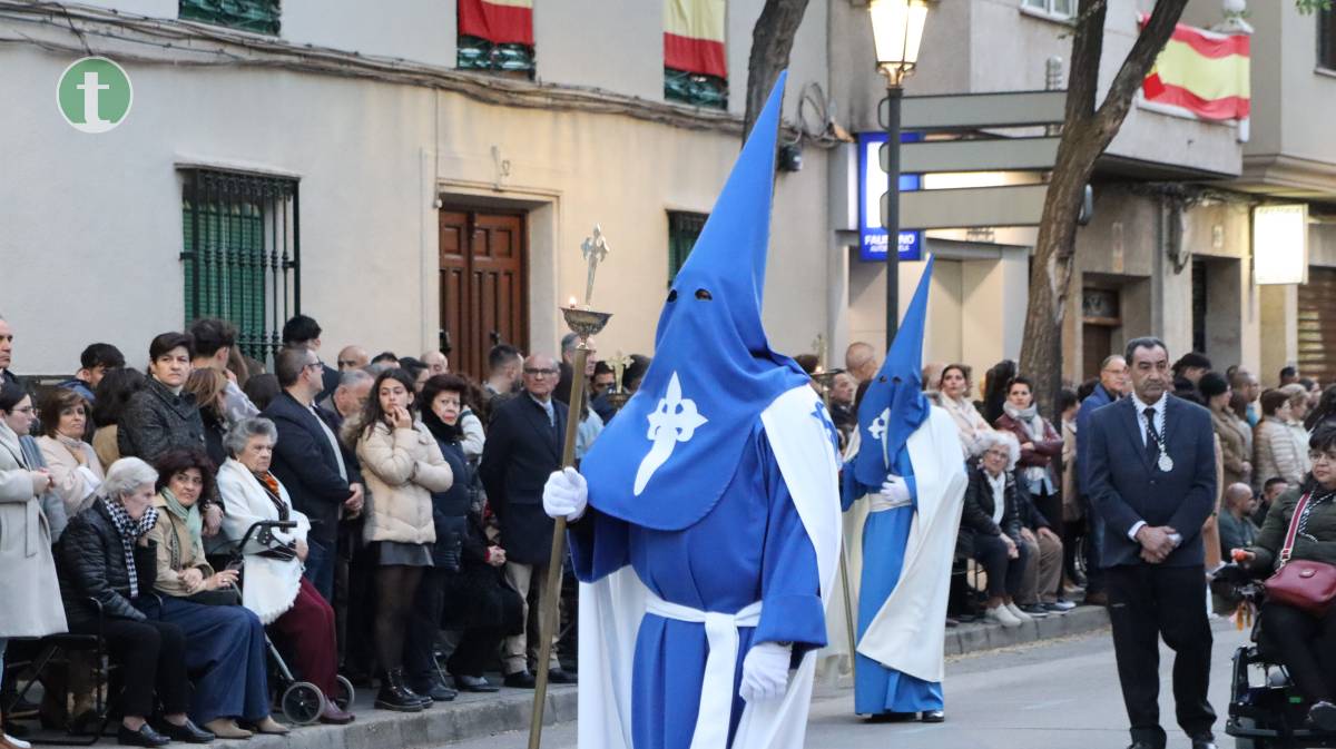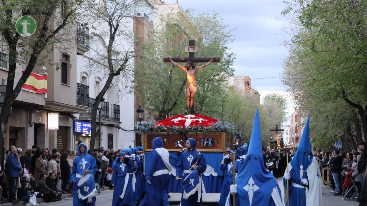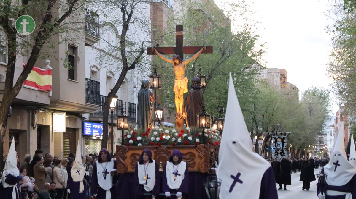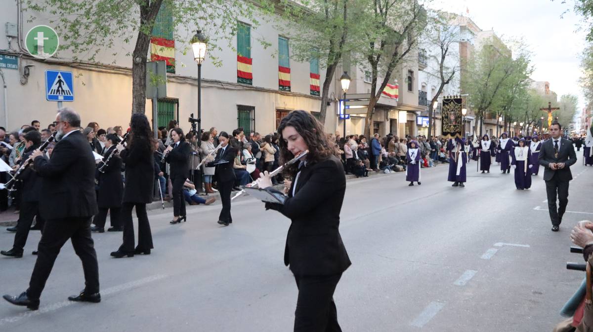 Abrió la procesión la Hermandad del Santísimo Cristo de la Misericordia, fundada en 1988, con dos pasos: La Crucifixión, portado por mujeres, y el Cristo de la Misericordia, llevado a hombros por hombres. Las imágenes, talladas en los talleres Salmerón y por el escultor José Lozano Roca respectivamente, avanzaron entre tambores y silencio. Los hermanos vistieron túnica azul, capa y fajín beige, capillo azul y guantes blancos, portando el báculo con cáliz y cruz de Santiago como atributo.