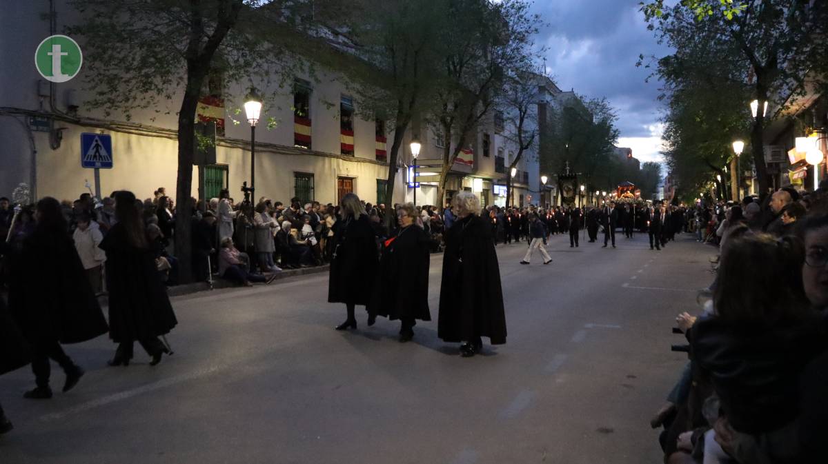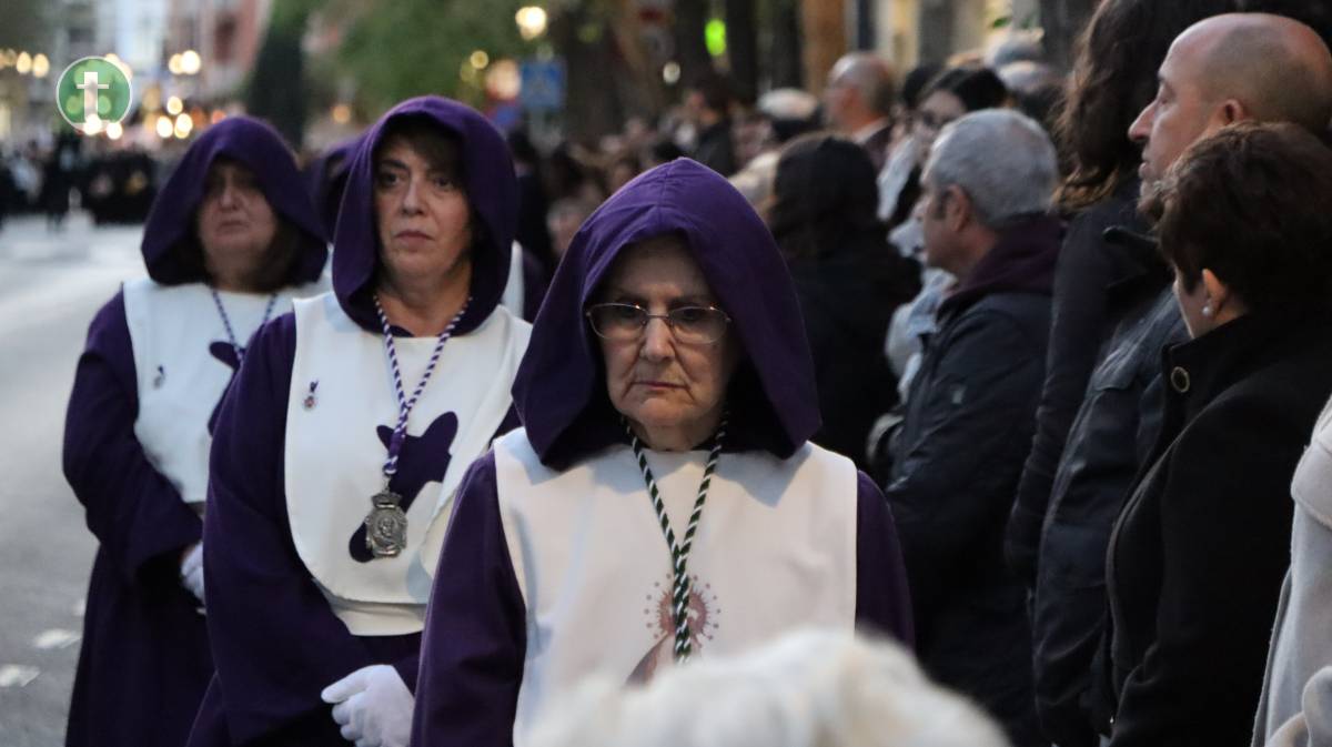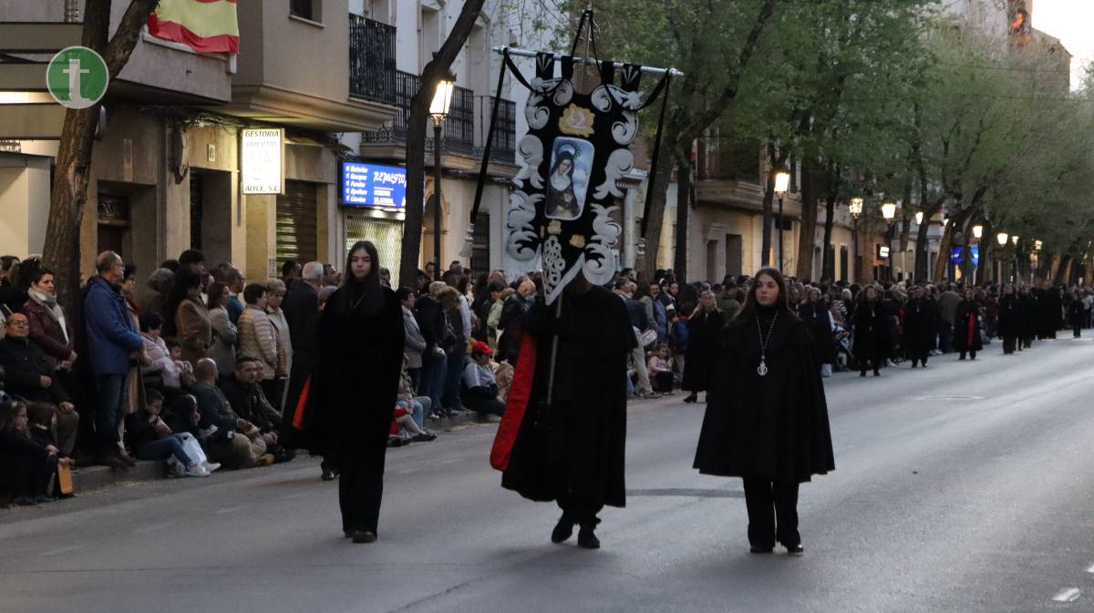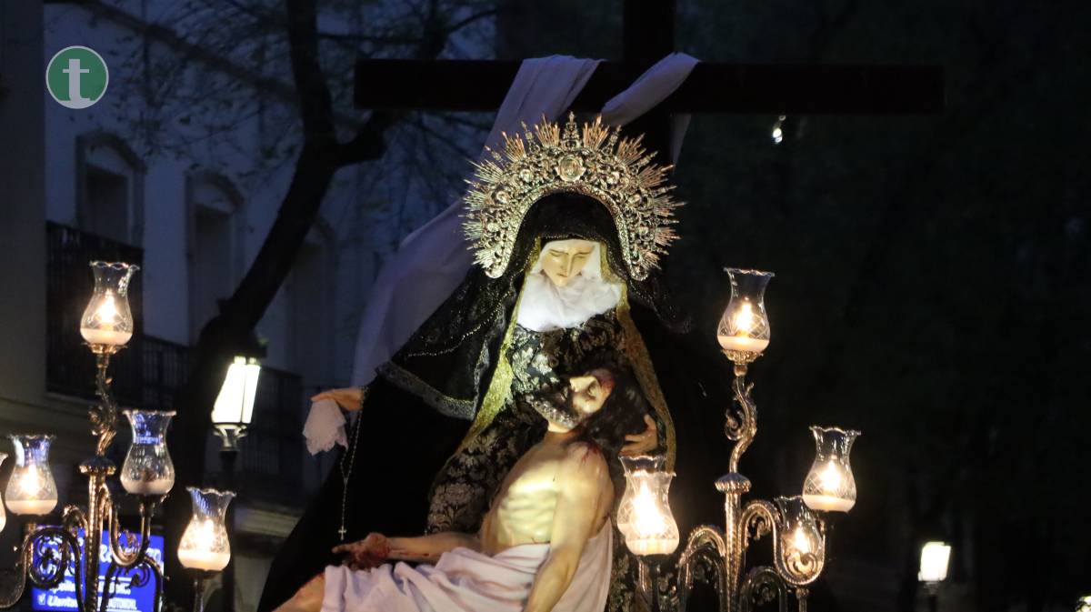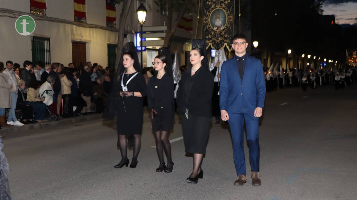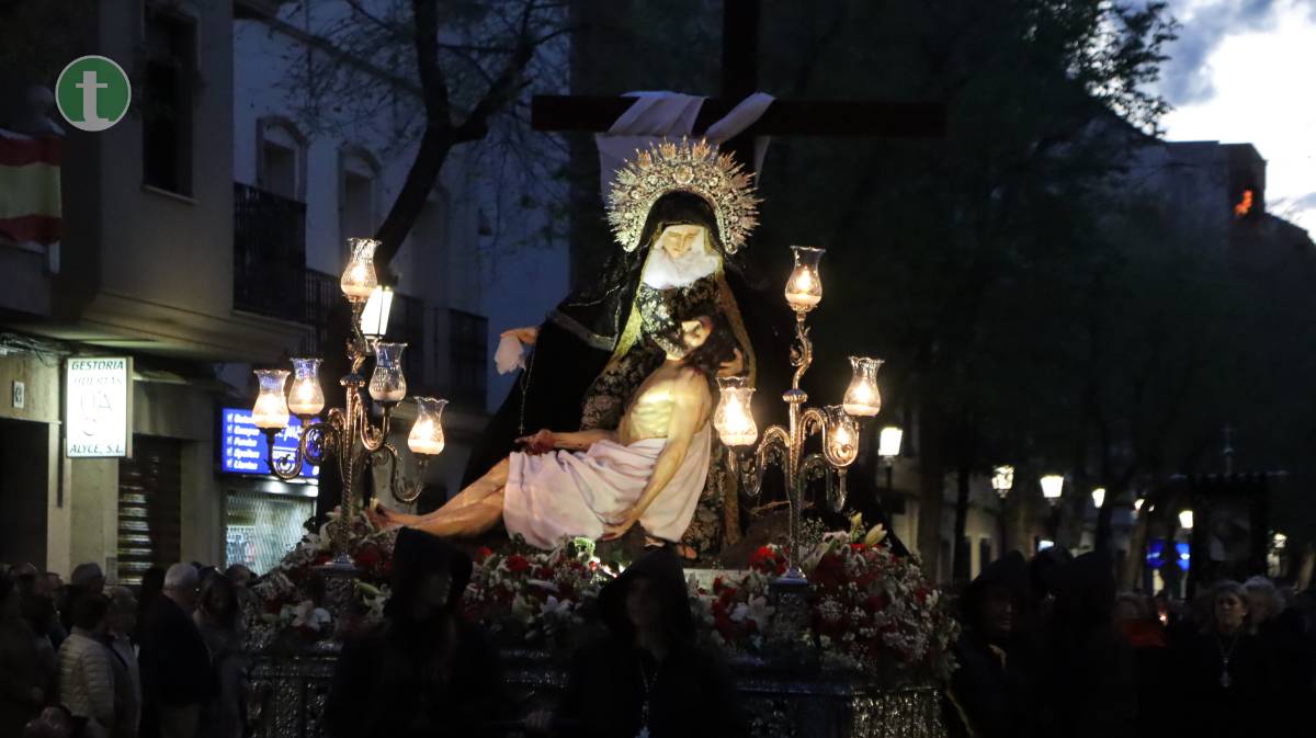 Desde la misma Parroquia de la Asunción salió también la Hermandad de Nuestra Señora de la Piedad en el Descendimiento, con una imagen centenaria y anónima que representa el momento en que Jesús es bajado de la cruz. El paso, empujado sobre ruedas por sus hermanos, transmite una escena cargada de dolor contenido y ternura. La uniformidad, completamente negra, con capa española, guantes y medalla de plata, reflejó el luto profundo de la Virgen.
