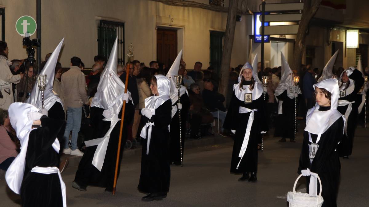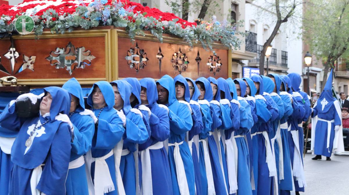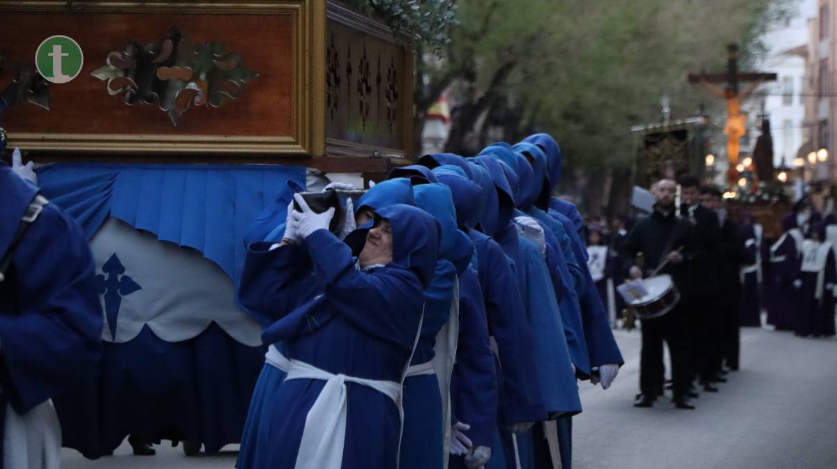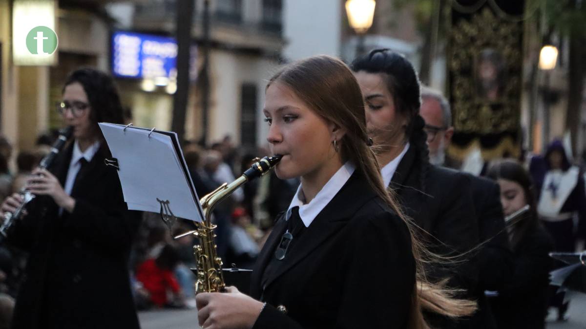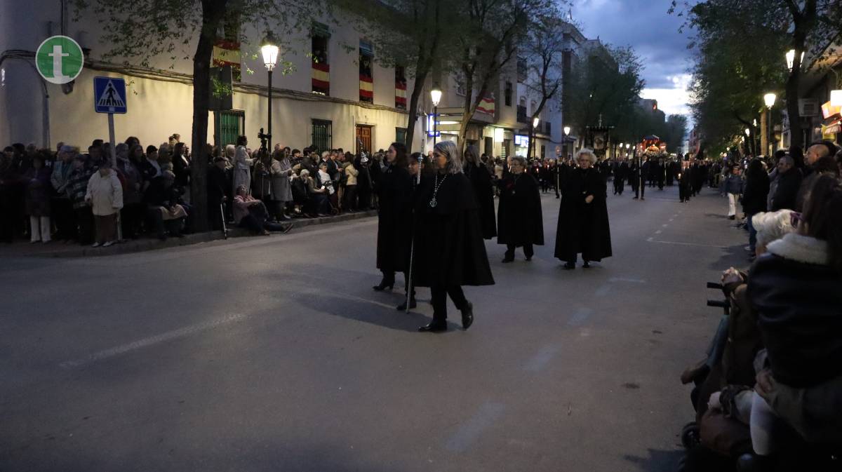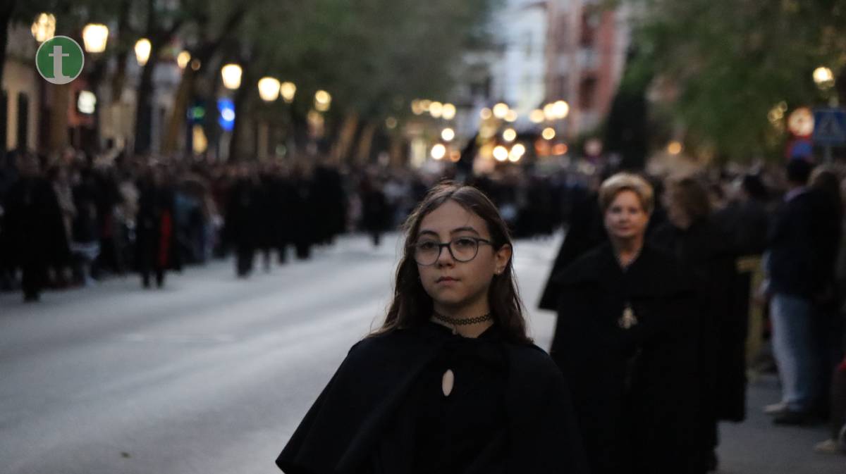 Desde la misma Parroquia de la Asunción salió también la Hermandad de Nuestra Señora de la Piedad en el Descendimiento, con una imagen centenaria y anónima que representa el momento en que Jesús es bajado de la cruz. El paso, empujado sobre ruedas por sus hermanos, transmite una escena cargada de dolor contenido y ternura. La uniformidad, completamente negra, con capa española, guantes y medalla de plata, reflejó el luto profundo de la Virgen.