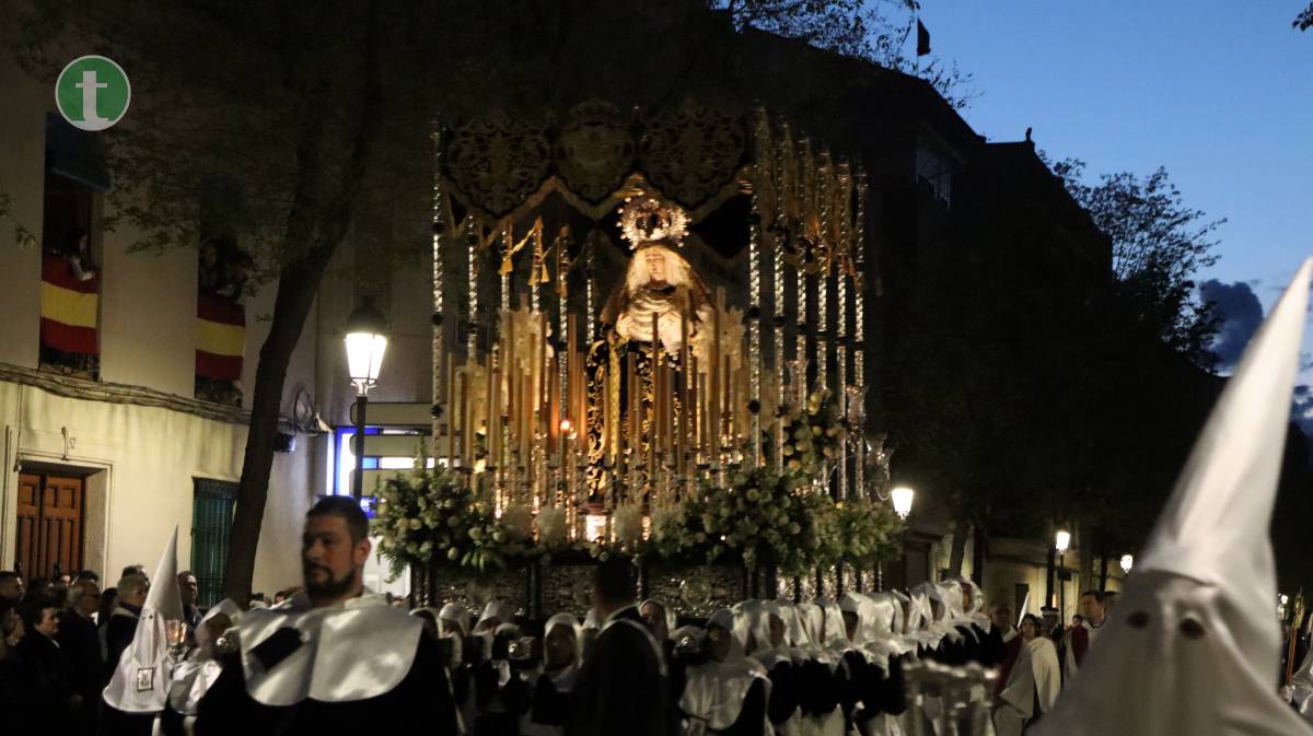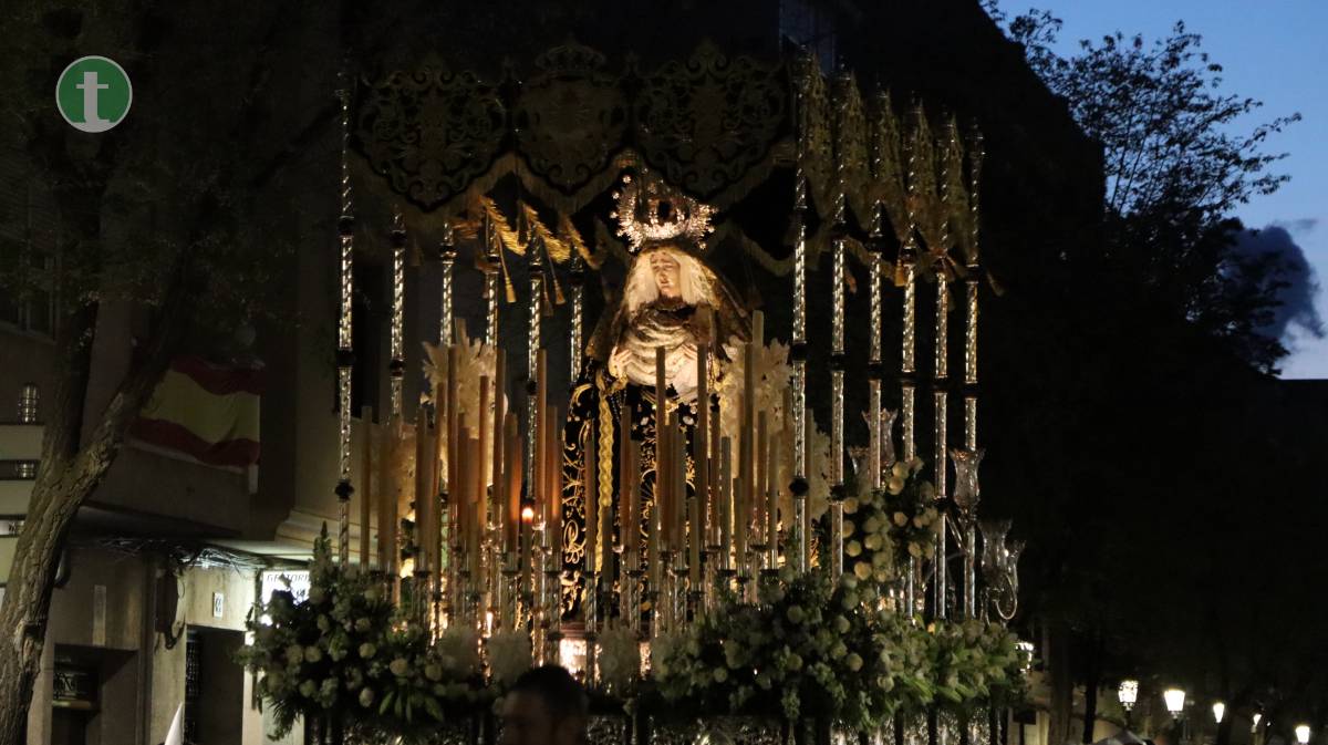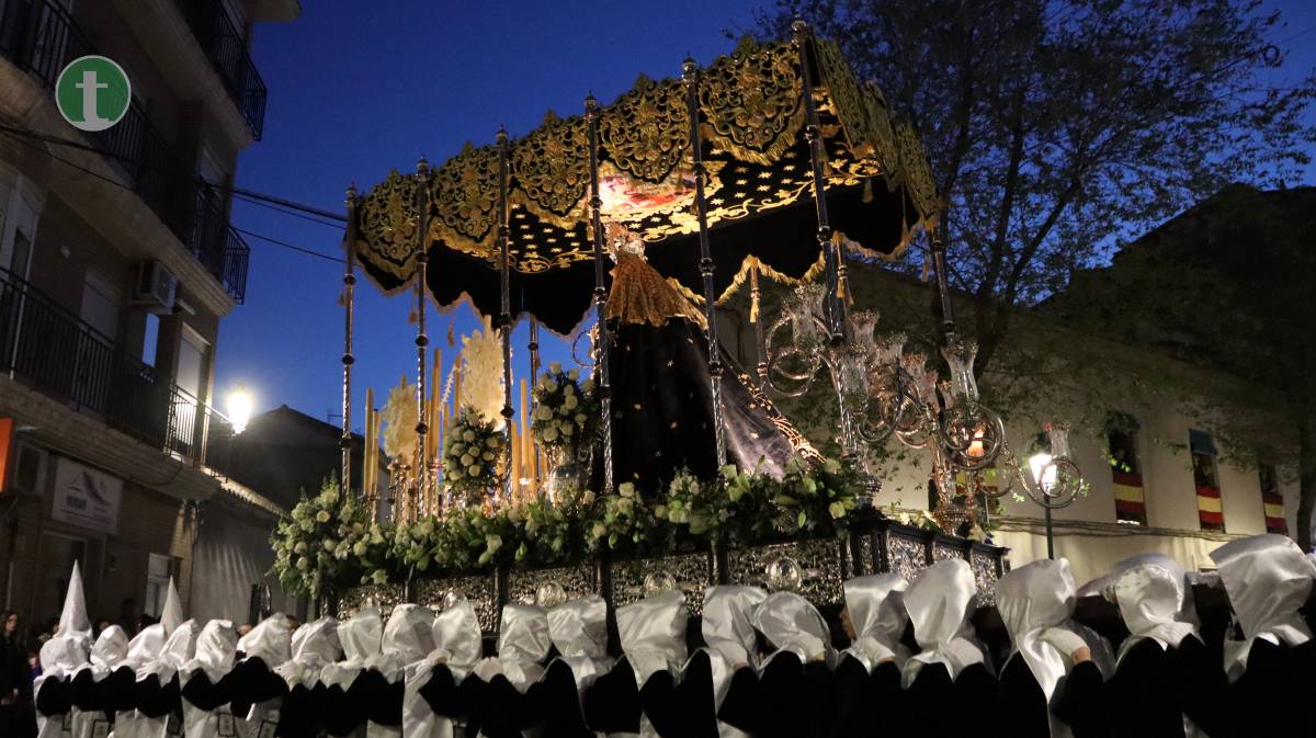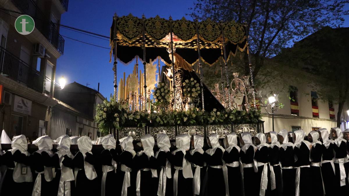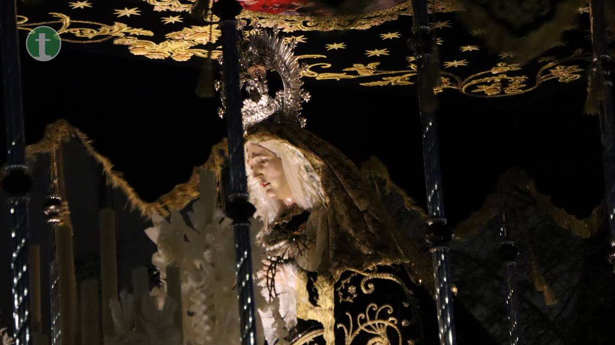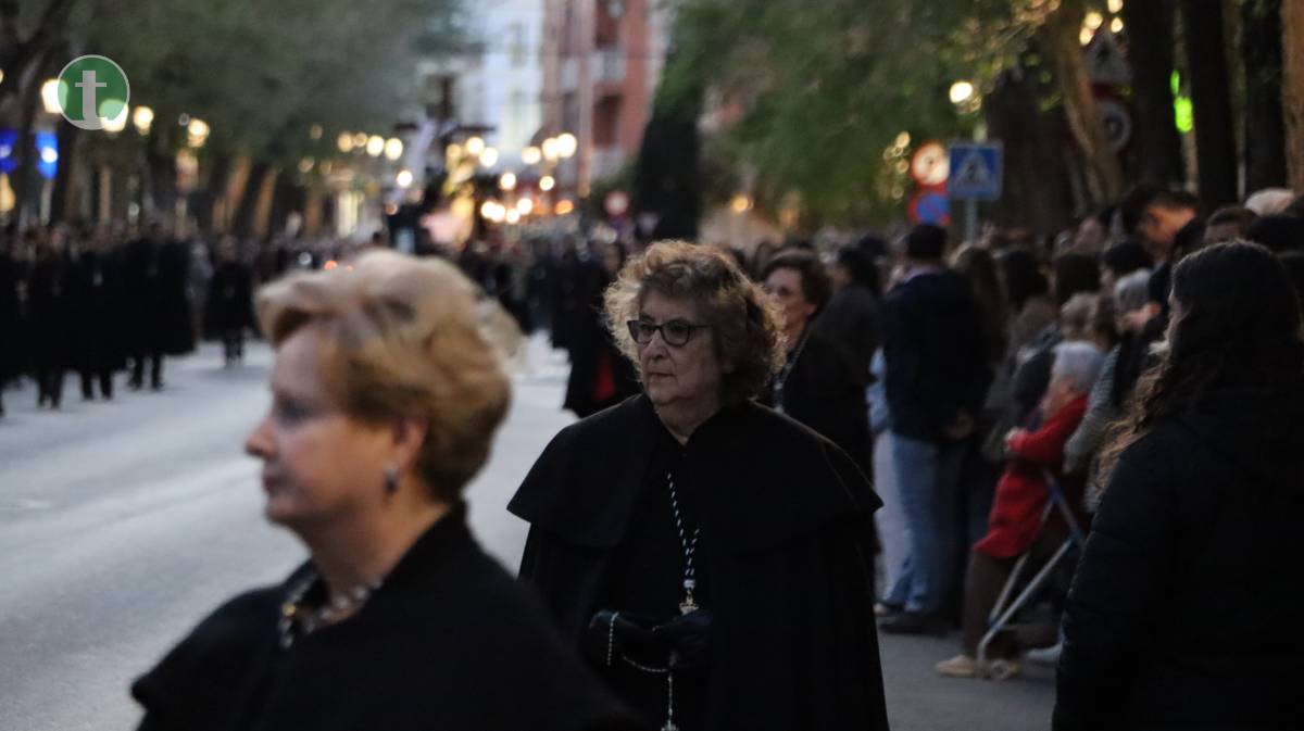 El momento más esperado llegó con la Hermandad de Nuestra Señora de la Soledad, que cerró la procesión con su majestuoso paso de palio, portado por 60 anderos. La imagen titular, obra del imaginero valenciano José Romero Tena (1940), representa a una Virgen rota de dolor, pero en pie, símbolo de fortaleza y esperanza. La hermandad, una de las más antiguas (fundada en 1942), avanzó con una estética impecable: túnica de terciopelo negro, fajín y capillo blanco, escapulario y guantes blancos. Las manolas, con mantilla española, rosario y luto riguroso, acompañaron en completo silencio. Cerraban la comitiva las autoridades civiles y eclesiásticas, junto al consiliario.