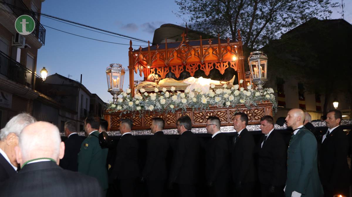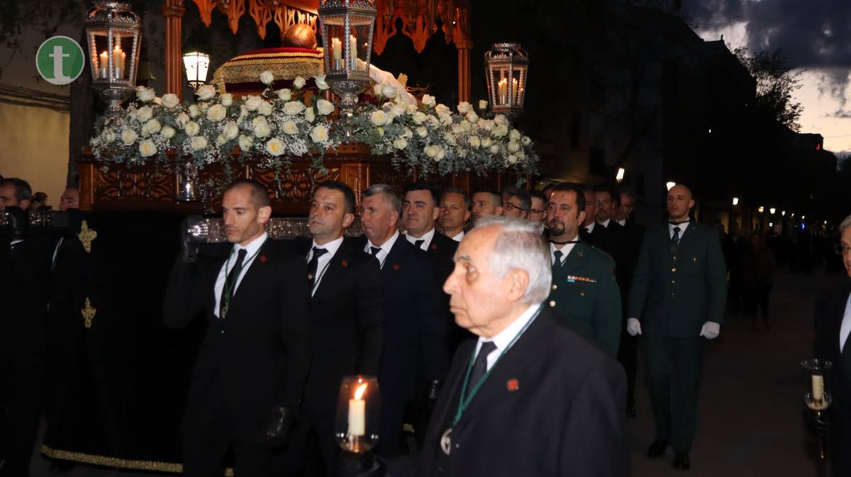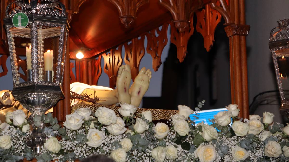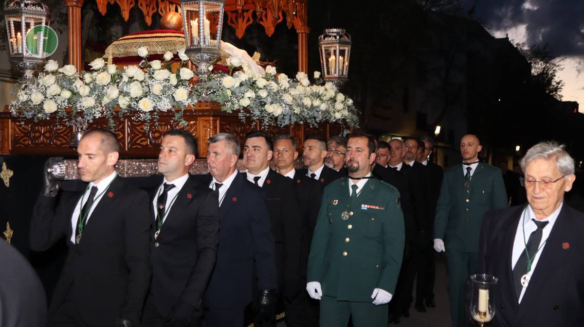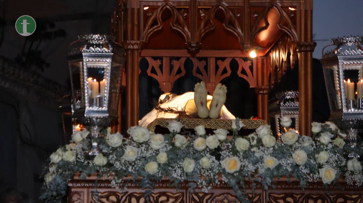 La Cofradía del Santo Sepulcro, fundada en 1972, llevó el cuerpo yacente de Cristo en un paso sobrio, escoltado por cuatro guardias civiles vestidos de gala y acompañado por hermanos vestidos con traje negro, camisa blanca y corbata, y mujeres con chaqueta y falda o pantalón oscuros. Todos portaron faroles dorados con tulipa de cristal, manteniendo un absoluto silencio.