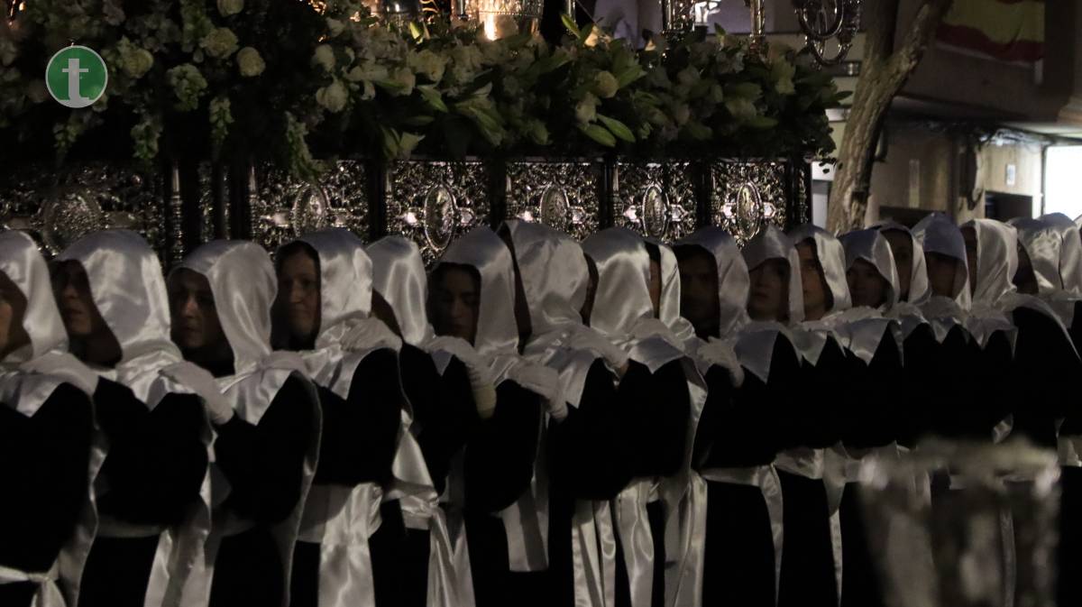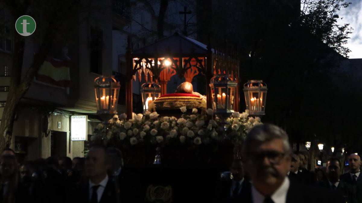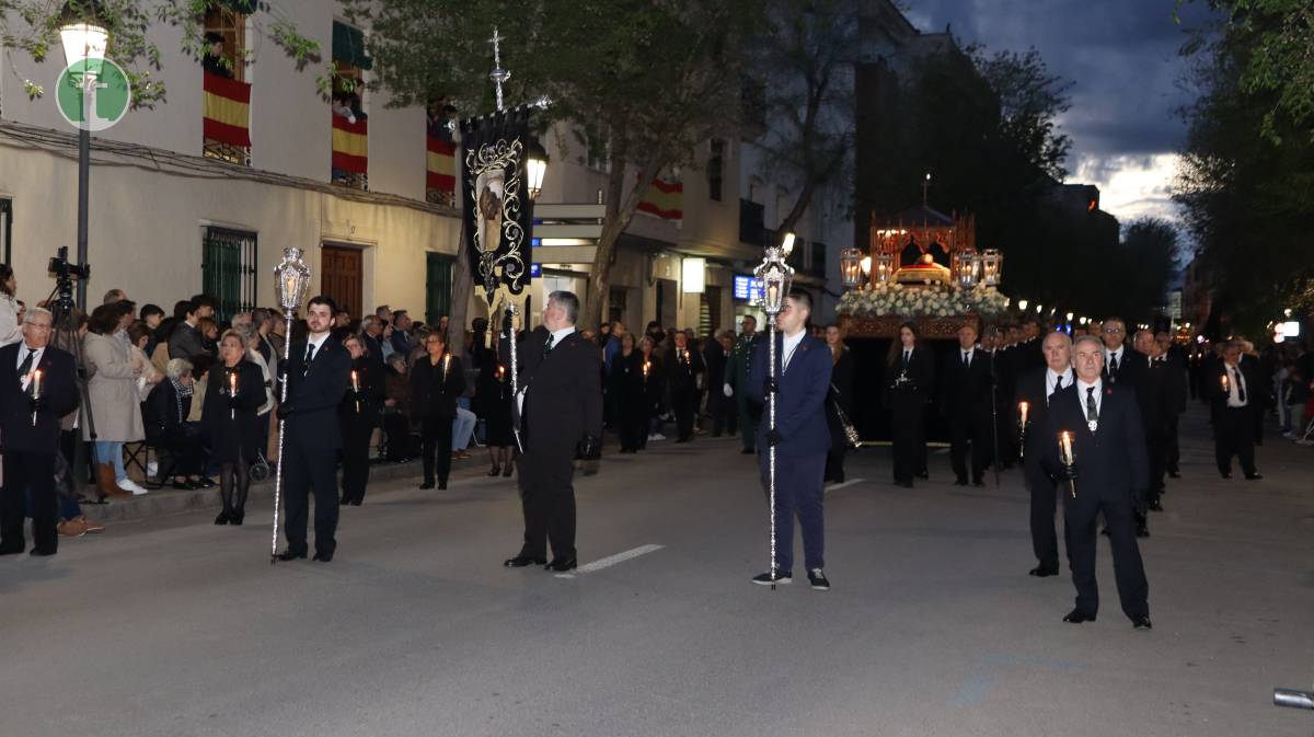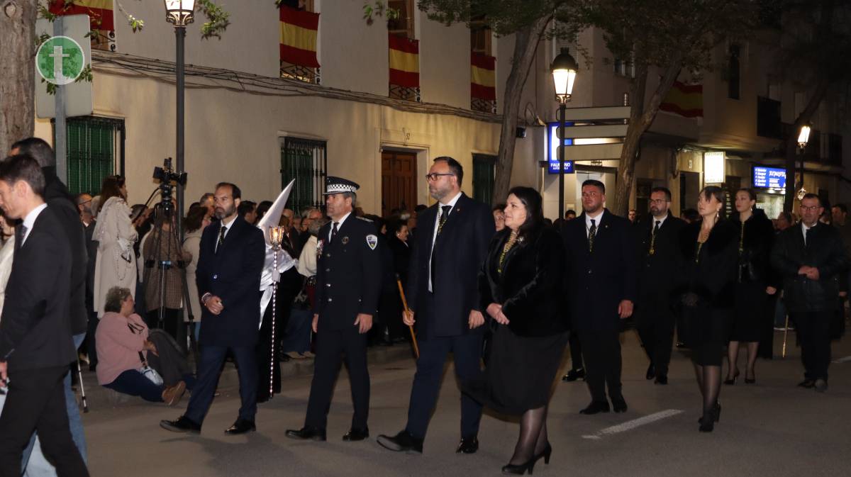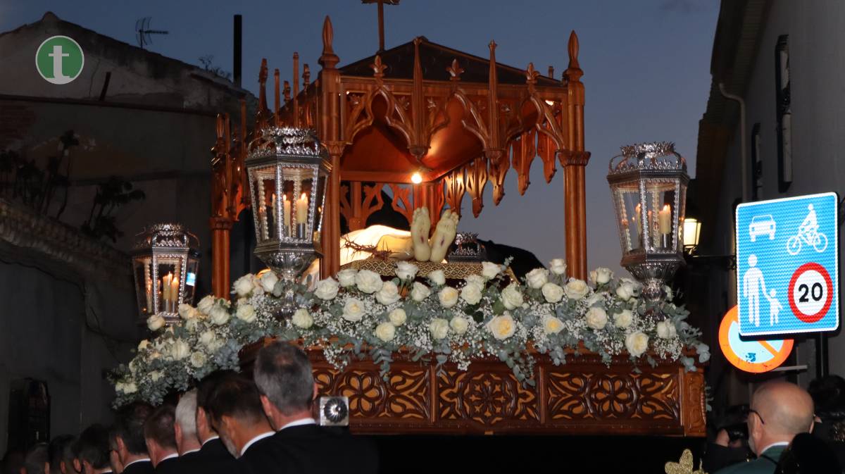 La Cofradía del Santo Sepulcro, fundada en 1972, llevó el cuerpo yacente de Cristo en un paso sobrio, escoltado por cuatro guardias civiles vestidos de gala y acompañado por hermanos vestidos con traje negro, camisa blanca y corbata, y mujeres con chaqueta y falda o pantalón oscuros. Todos portaron faroles dorados con tulipa de cristal, manteniendo un absoluto silencio.