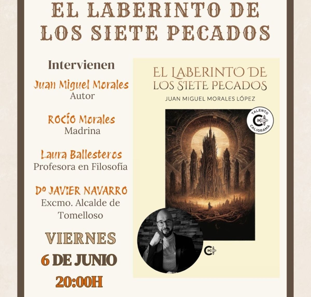 Tomelloso acogerá la presentación del libro «El laberinto de los siete pecados«, de Juan Miguel Morales, que tendrá lugar el próximo viernes 6 de junio a las 20:00 horas en la Biblioteca Municipal.
