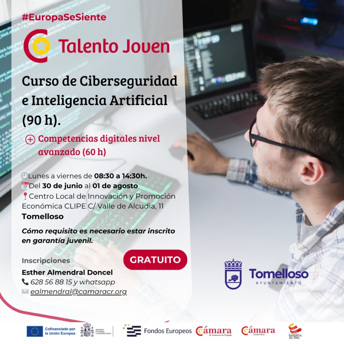 La concejalía de Promoción Económica del Ayuntamiento de Tomelloso anuncia la puesta en marcha de un curso de Ciberseguridad e Inteligencia Artificial, dirigido a jóvenes menores de 30 años inscritos en el programa de Garantía Juvenil. El curso se impartirá en las instalaciones del CLIPE de Tomelloso, de lunes a viernes en horario de 8:30 a 14:30 horas, desde el 30 de junio hasta el 1 de agosto, con una duración total de 150 horas.