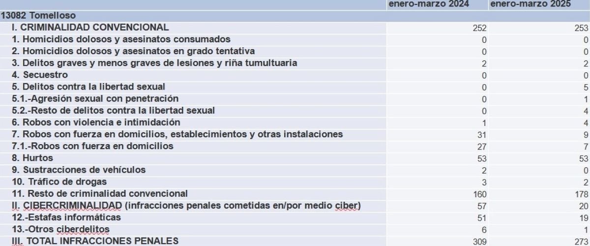 Tomelloso ha registrado un descenso en el número total de infracciones penales durante el primer trimestre de 2025, según el último Balance de Criminalidad publicado por el Ministerio del Interior. Entre enero y marzo se contabilizaron 273 delitos, frente a los 309 del mismo periodo de 2024, lo que supone una reducción del 11,65 %. Esta mejora se debe en gran medida a la bajada de los delitos cometidos por medios digitales y a una caída destacada de los robos con fuerza en domicilios.