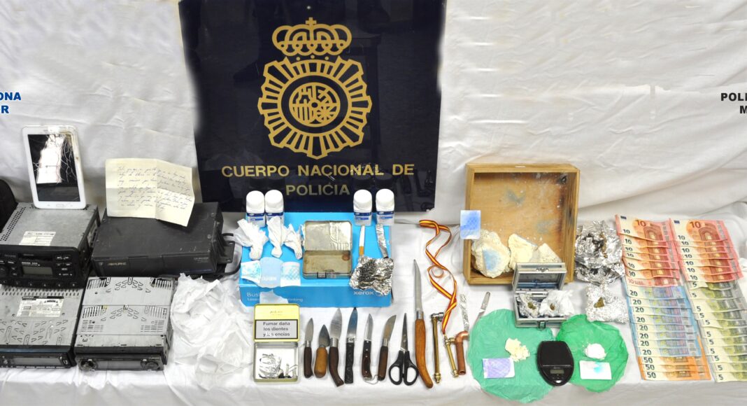 Acabado el registro se procedió a la detención de los dos residentes habituales como presuntos autores de los delitos de tráfico de sustancias estupefacientes y de receptación de objetos robados.