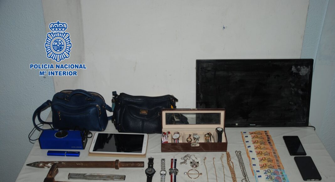 Durante el cacheo realizado a los detenidos, se les intervinieron 420 euros en efectivo, una tablet, joyas, relojes y dos teléfonos móviles. Además, los policías localizaron una bolsa de color verde que contenía una televisión, una caja con seis relojes, joyas, y otros efectos.