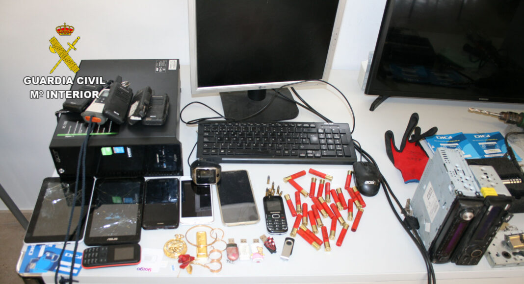 Como resultado de estos registros se hallaron numerosos efectos tales como un inhibidor de frecuencia, Walki talkies, ganzúas, un extractor eléctrico de bombín de cerrajería, llaves de grifa, palanca tipo “pata de cabra”, bomba para extraer el gasoil, guantes y ropa oscura. Igualmente se recuperaron varias joyas de oro, una tv, dos tablets, varios terminales telefónicos, ordenadores, un juego de luces de discoteca, unas espadas y hachas, herramienta variada y 1 cartucho de munición de de 9 mm parabelum.