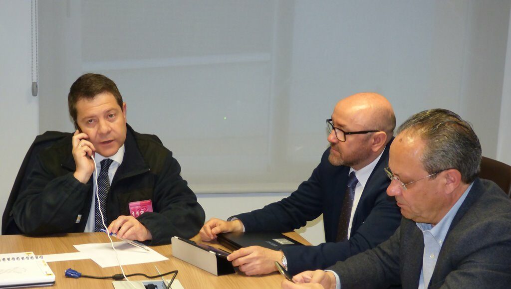 Tras la activación del Plan Territorial de Emergencias de Castilla-La Mancha (PLATECAM) en fase de emergencia nivel 1, el presidente de la región, Emiliano García-Page, acompañado del consejero de Hacienda y Administraciones Públicas, Juan Alfonso Ruiz Molina, se encuentran en el Centro de Coordinación Operativa (CECOP) de la Dirección General de Protección Ciudadana realizando el seguimiento de la emergencia.