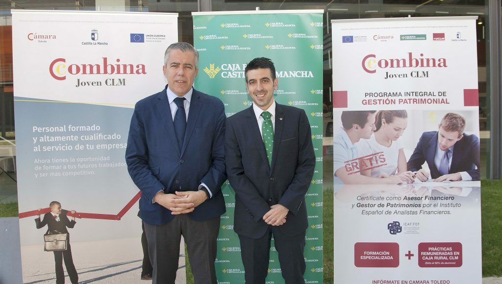 Caja Rural Castilla-La Mancha, en colaboración con la Cámara de Comercio de Toledo, han presentado esta mañana en el Recinto Talavera Ferial de la ciudad toledana el “Plan Combina Joven CLM”, una iniciativa que permitirá a 130 jóvenes recibir formación encaminada a conseguir el certificado de Asesor Financiero y optar posteriormente a realizar prácticas remuneradas en empresas.