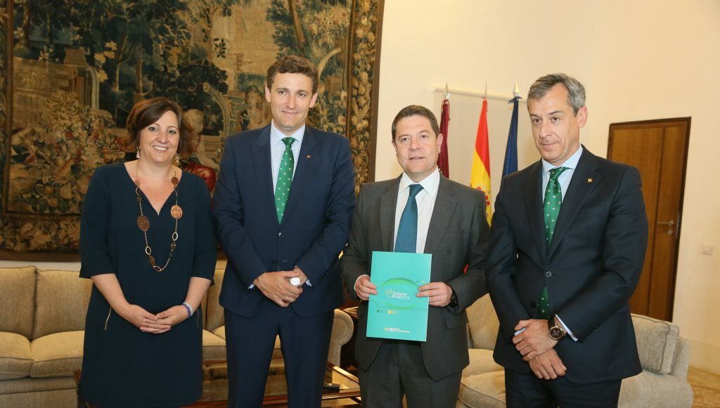 El presidente de Caja Rural Castilla-La Mancha, Javier López Martín, y el director general de la misma, Víctor Manuel Martín López, han entregado al presidente de la Junta de Comunidades de Castilla-La Mancha, Emiliano García-Page, y a la consejera de Economía, Empresas y Empleo, Patricia Franco Jiménez, la Memoria Anual de la entidad correspondiente al ejercicio 2016, que será presentada a la Asamblea General de socios de la cooperativa de crédito convocada para este viernes 28 de abril.