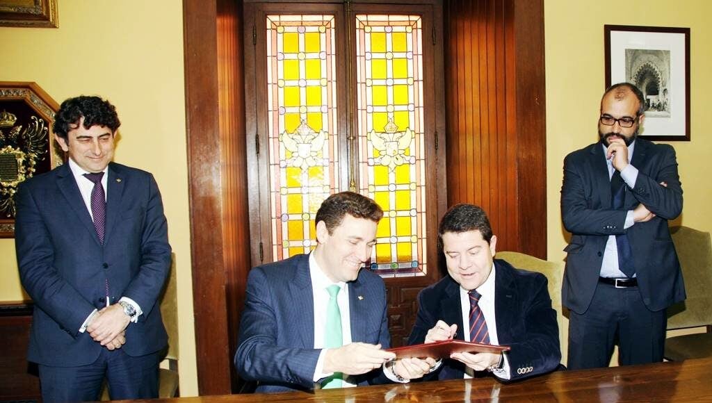 El director general de Caja Rural Castilla-La Mancha, Víctor Manuel Martín López, y el alcalde de Toledo, Emiliano García-Page, han rubricado hoy un convenio de colaboración a través del cual la entidad financiera aportará 15.000 euros para fomentar la práctica deportiva en la ciudad, a través de las actividades gestionadas por el Patronato Deportivo Municipal.