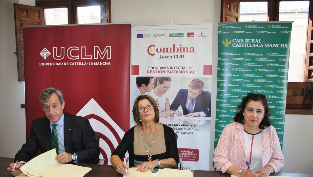 Cámara de Comercio de Toledo, Caja Rural Castilla-La Mancha y Universidad de Castilla-La Mancha han firmado un convenio de colaboración para la puesta en marcha del proyecto “Combina Joven CLM”, por el que 130 jóvenes recibirán formación encaminada a conseguir el certificado de Asesor Financiero y podrán optar a prácticas remuneradas para iniciar su contacto con el mundo de la empresa.