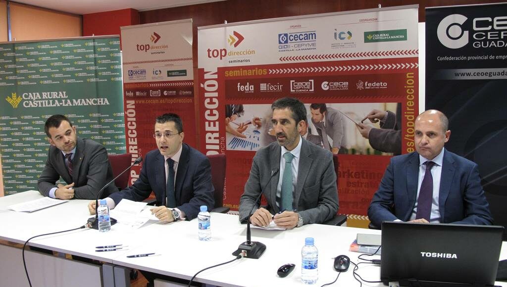 Numerosos empresarios se congregaron hoy en el CEEI de Guadalajara para participar en la primera sesión en esta provincia de los IV Seminarios “Top Dirección”, organizados por la Confederación Regional de Empresarios (CECAM), en colaboración con Caja Rural Castilla-La Mancha y su Fundación a través del Instituto de Innovación y Competitividad, con el objetivo de responder a sus inquietudes en temas de máximo interés empresarial.