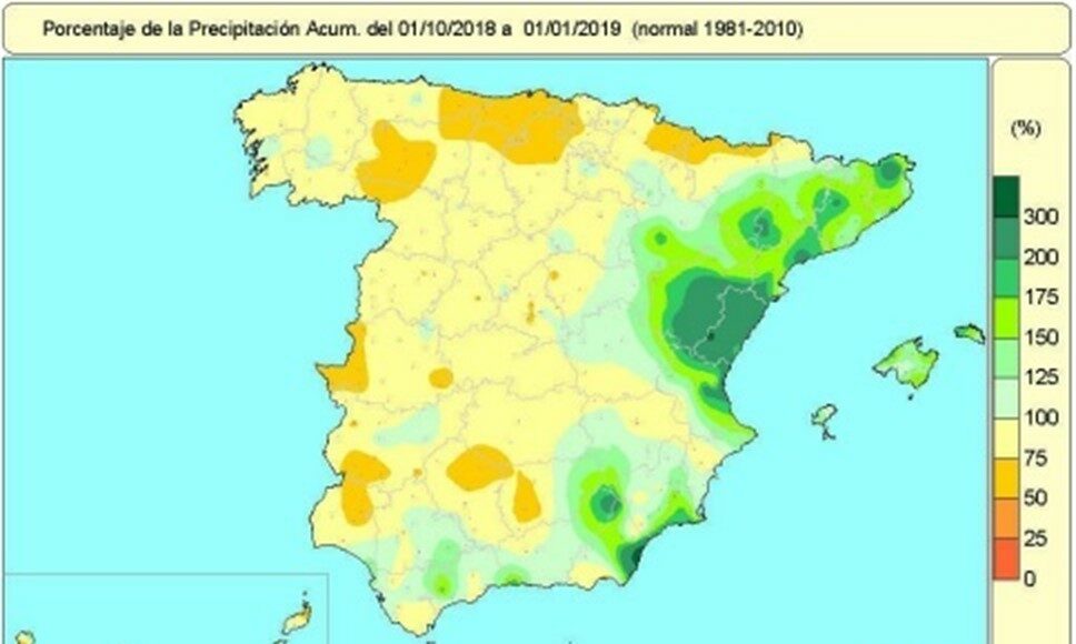 Las precipitaciones acumuladas en el primer trimestre del año hidrológico, que comenzó el 1 de octubre de 2018, hasta el 1 de enero de 2019 se sitúan un 3 por ciento por debajo del valor normal, con un total de 232 litros por metro cuadrado frente a los 239 litros por metro cuadrado que serían el valor normal para el conjunto de España, según la Agencia Estatal de Meteorología (AEMET).