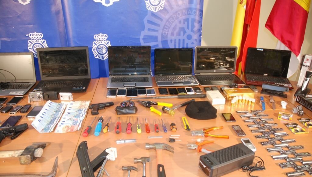 Finalmente, los policías llevaron a cabo cuatro registros en diferentes domicilios de Guadalajara en los que hallaron gran número de pruebas e indicios entre los efectos intervenidos, como herramientas para cometer robos, dos pistolas simuladas, varios teléfonos móviles, seis ordenadores portátiles, así como grandes cantidades de dinero en efectivo y diversos efectos procedentes de los robos. A los arrestados se les considera responsables de más de cincuenta robos con fuerza en locales comerciales.