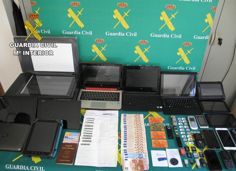 Durante los últimos días del mes de febrero y una vez obtenidos estos datos, la Guardia Civil registró el citado domicilio, que los autores de estos hechos utilizaban como base de operaciones para realizar estas estafas e intervino los originales de varios documentos nacionales de identidad, pasaportes, comprobantes de empresas de envíos de dinero, un escáner, varias tarjetas bancarias, fotocopias de solicitudes de créditos a entidades crediticias a nombre de diversas personas, teléfonos móviles, tarjeteas SIM, ordenadores, tabletas y 1.100 euros en metálico.