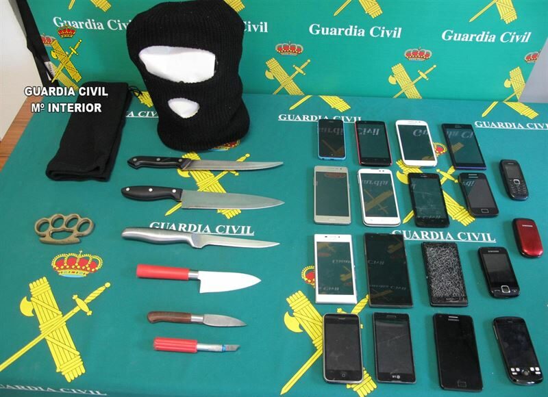 Como resultado de las entradas y registros realizadas en dos domicilios de la localidad de Azuqueca de Henares, pertenecientes a los miembros del grupo organizado, la Guardia Civil incautó gran cantidad de teléfonos móviles que habían sido sustraídos así como los efectos utilizados para su sustracción, las armas blancas y la ropa utilizada por estas personas.