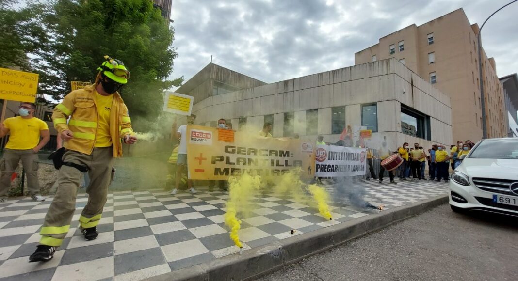 La marcha de protesta ha partido de la plaza de Zocodover encabezada por una pancarta con el lema ‘La Consejería y Geacam queman al bombero forestal’, y durante casi dos horas los manifestantes han caminado hasta la sede del Gobierno regional en el Palacio de Fuensalida, donde han leído un manifiesto que explica la situación de los trabajadores y trabajadoras de Geacam y las reivindicaciones que se mantienen tras casi nueve años sin mejoras en el convenio colectivo.