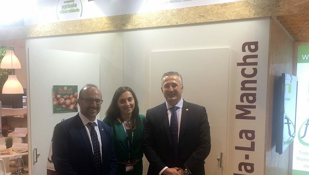 El director de Banca Rural de Globalcaja, Alberto Marcilla, acompañado del responsable de este Area en Albacete, Rafael Mendoza, visitaron la Feria Internacional del Sector de Frutas y Hortalizas (Fruit Atraction), que tiene lugar en Ifema (Madrid), los días 5 al 7 de octubre. Ambos estuvieron apoyando a las diferentes empresas y cooperativas de la región, presentes en este certamen, como una muestra de su compromiso con el sector, que tiene un gran peso económico y social en Castilla-La Mancha. Esta feria reúne a más de 1200 empresas expositoras, más de 40.000 metros cuadrados de oferta hortofrutícola y participan más de 55.000 profesionales de cien países. Marcilla ha subrayado la importancia de estar presentes en ferias de estas características, ya que son un marco idóneo para la promoción de los excelentes productos de nuestra tierra. En la imagen, un momento de dicha visita, con una responsable de Ferimel, donde ha ofrecido a las empresas castellano-manchegas, los servicios que ofrece Globalcaja, tanto en el ámbito rural como en el mercado exterior.