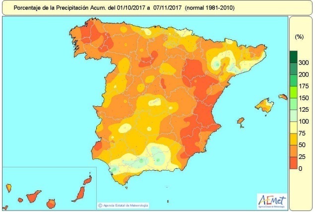 De hecho, en la mayor parte del territorio las precipitaciones están por debajo del 75 por ciento de lo normal e incluso no llegan al 25 por ciento de las cantidades normales para este periodo en muchas zonas de Galicia, la mitad sur de Aragón, en el levante, al oeste de la provincia de Huelva, en un área entre las provincias de Valladolid, Palencia y Burgos y en el archipiélago canario.