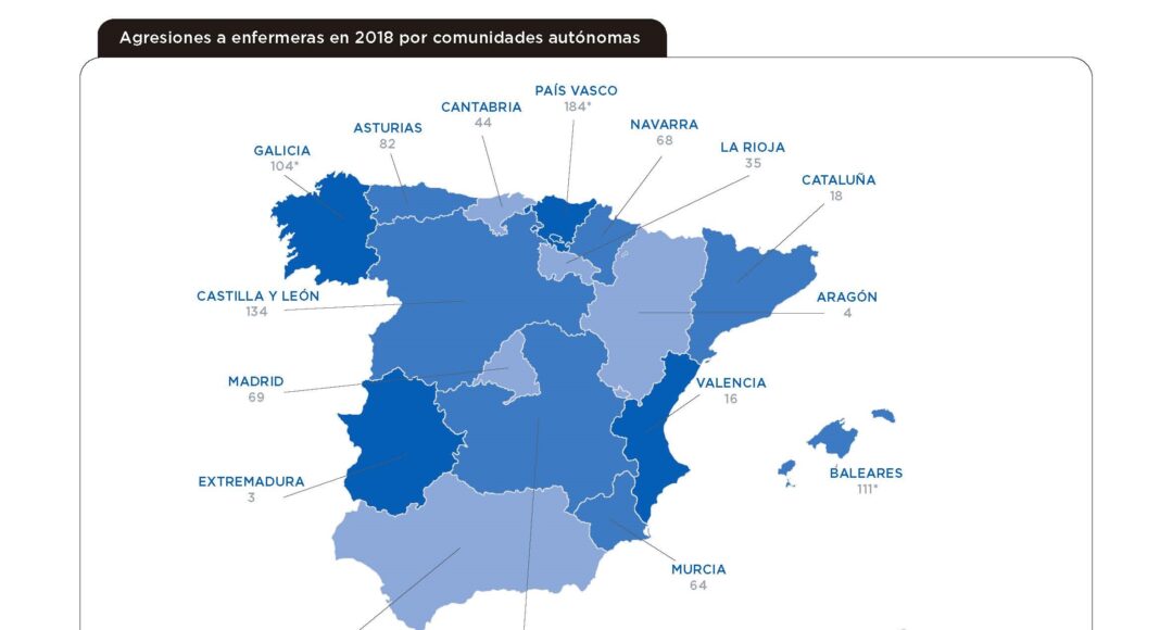 El Observatorio Nacional de Agresiones a Enfermeros del Consejo General de Enfermería ha registrado un total de 1.469 agresiones en 2018. Por comunidades autónomas, Andalucía es la que ha registrado un mayor número de agresiones con 373; seguida de País Vasco, con 184 y Castilla-La Mancha, con 145.