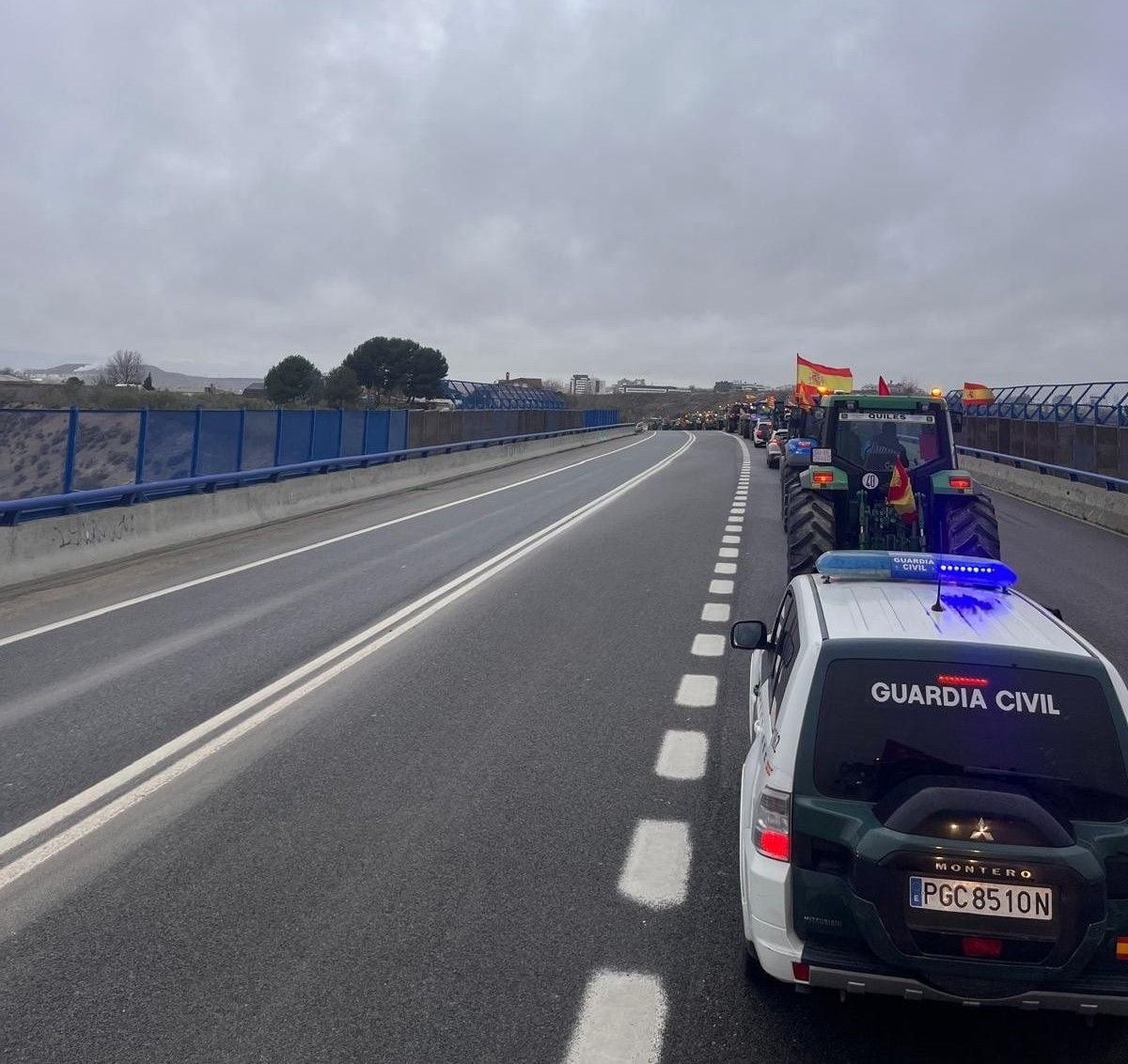 En el caso de Toledo, 83 tractores han partido en dirección a Torrejón de la Calzada (Madrid), escoltados por la Guardia Civil hasta el límite con la Comunidad de Madrid, con el objetivo de garantizar la seguridad vial durante el trayecto.