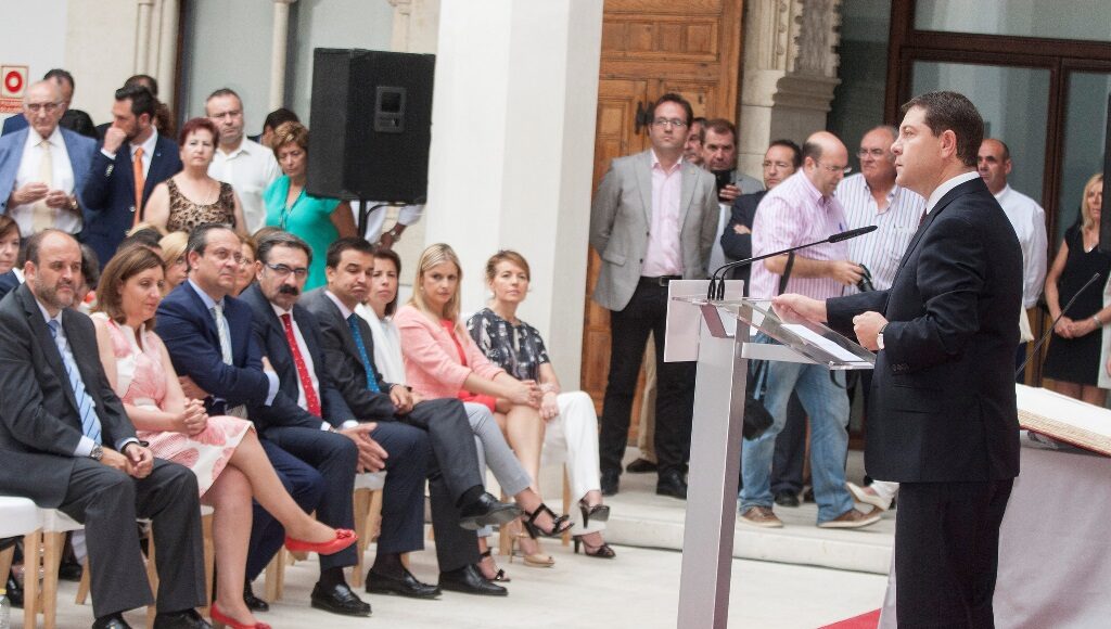 En un acto celebrado en el patio del Palacio de Fue salida, sede de la Presidencia regional, ante alrededor de 400 asistentes, Emiliano García-Page ha comenzado por dar las gracias a los familiares de los nuevos consejeros, porque la dedicación que les va a exigir su nueva función les va a quitar mucho tiempo de estar con los suyos.