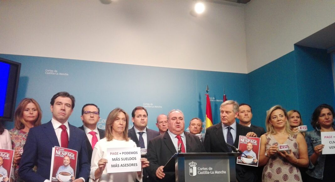 Así lo ha indicado en rueda de prensa el secretario regional del PP, Vicente Tirado, quien ha estado acompañado por todos los miembros del Grupo Parlamentario Popular, quienes han mostrado pancartas en las que se podía leer ‘Page + Podemos: Más sueldos, más asesores’ o ‘Castilla-La Mancha no es como Venezuela’.