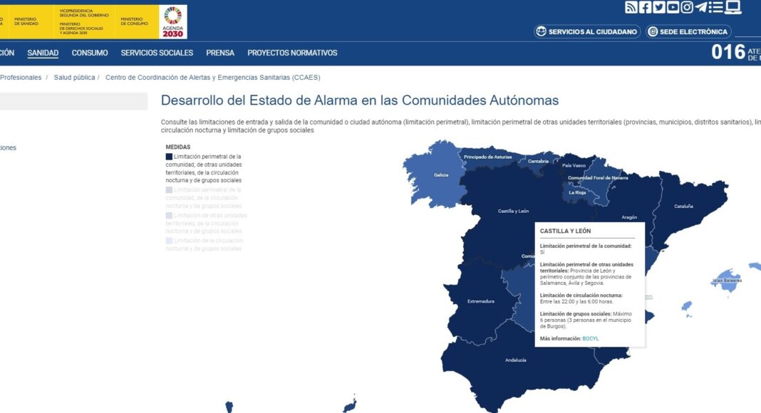 El Ministerio de Sanidad ha publicado este miércoles en su página web un mapa interactivo que recoge las medidas de contención del Covid-19 que cada comunidad autónoma mantiene vigentes bajo el estado de alarma, de modo que permitirá a los ciudadanos comprobar las limitaciones de movilidad nocturna y sus horarios.