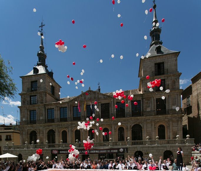 Para batir este Record Guinness, han hecho falta 76 cortadores de jamón procedentes de todos los rincones de España, que desde las 10h se dieron cita ante la catedral de la capital castellano-manchega, bajo la atenta mirada de cientos de espectadores y la supervisión notarial correspondiente. Además, se emplearon 112 jamones Tello con el sello del Consorcio del Jamón Serrano Español, los cuales una vez loncheados se dispusieron en un plato que ocupó una superficie de 140 m2. En total, las miles de lonchas de jamón de excelente calidad, compusieron un plato de 392 kilos de jamón serrano Tello.