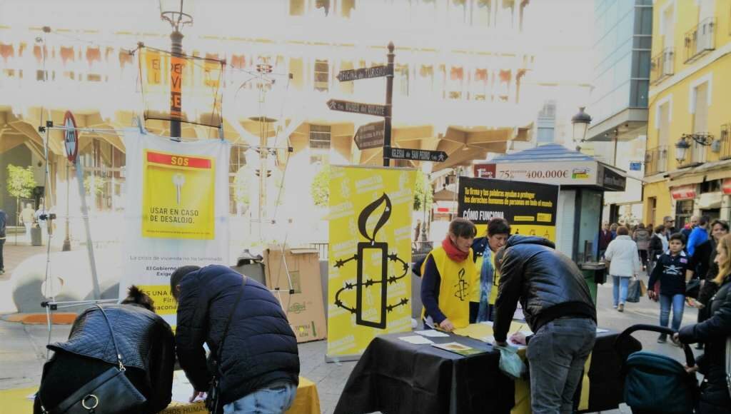 El sábado 18 de noviembre, Amnistía Internacional organizó sendos actos en las calles de Talavera y Ciudad Real para exigir al Gobierno Central la adopción de un Protocolo Marco sobre desalojos orientado a garantizar la coordinación entre juzgados y autoridades municipales para asegurar alternativas de vivienda a las personas que no dispongan de recursos y a trabajar en coordinación con las Comunidades Autónomas para destinar más recursos a ampliar el parque de vivienda social y proporcionar ayudas adecuadas a la vivienda.