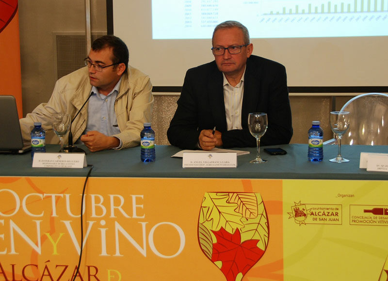 La segunda de las conferencias del programa de actividades ‘Octubre, ven y vino 2014’, celebrada ayer jueves en el Ayuntamiento de Alcázar de San Juan, se dedicó a un tema de actualidad y de gran importancia para el sector del vino, como es la Ley de Cooperativas, de la que hablaron el presidente de Cooperativas Agroalimentarias, Ángel Villafranca, y el responsable de Relaciones Corporativas de Dcoop, Esteban Carneros, dos de los responsables que han protagonizado este año la mayor fusión de cooperativas agroalimentarias de España a nivel supra regional, convirtiéndose en líderes nacionales en producción y comercialización de vino y de aceite.