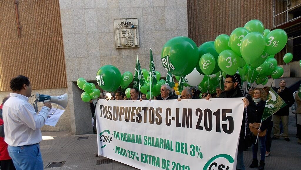 Cerca de una treintena de trabajadores funcionarios de la Administración regional se han concentrado este jueves en Ciudad Real para reclamar a la Junta la devolución del tres por ciento de su salario y de una parte proporcional del 25 por ciento de la paga extra de Navidad del año 2012 que se les adeuda.