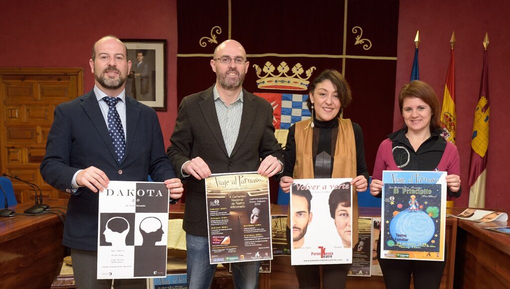 Valencia, Córdoba, Boecillo (Valladolid) y Talavera de la Reina (Toledo) son los lugares de procedencia de los grupos participantes de este año en el X Certamen Nacional de Teatro Aficionado “Viaje al Parnaso”, que ha presentado este martes el alcalde de Argamasilla de Alba, Pedro Ángel Jiménez, y la directora de Primer Acto Teatro, María Eugenia Moya, acompañados de los representantes de Globalcaja, Santiago Masa, y de Reale Seguros, Mónica Cantón.
